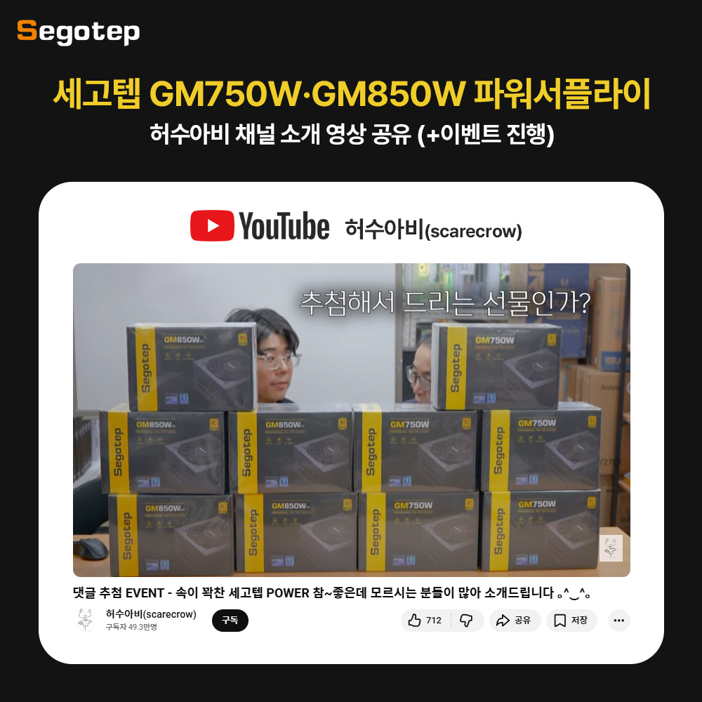 ¶ÇÇÑ, À¯Æ©ºê ¿µ»ó ´ñ±ÛÀ» ³²±ä ½ÃûÀÚ¸¦ ´ë»óÀ¸·Î Ãß÷À» ÅëÇØ Segotep GM850W 80PLUS GOLD Ç®¸ðµâ·¯ ATX 3.1(5¸í), Segotep GM750W 80PLUS GOLD Ç®¸ðµâ·¯ ATX 3.1(5¸í)À» ÁõÁ¤ÇÏ´Â À̺¥Æ®µµ ÁøÇàµË´Ï´Ù.